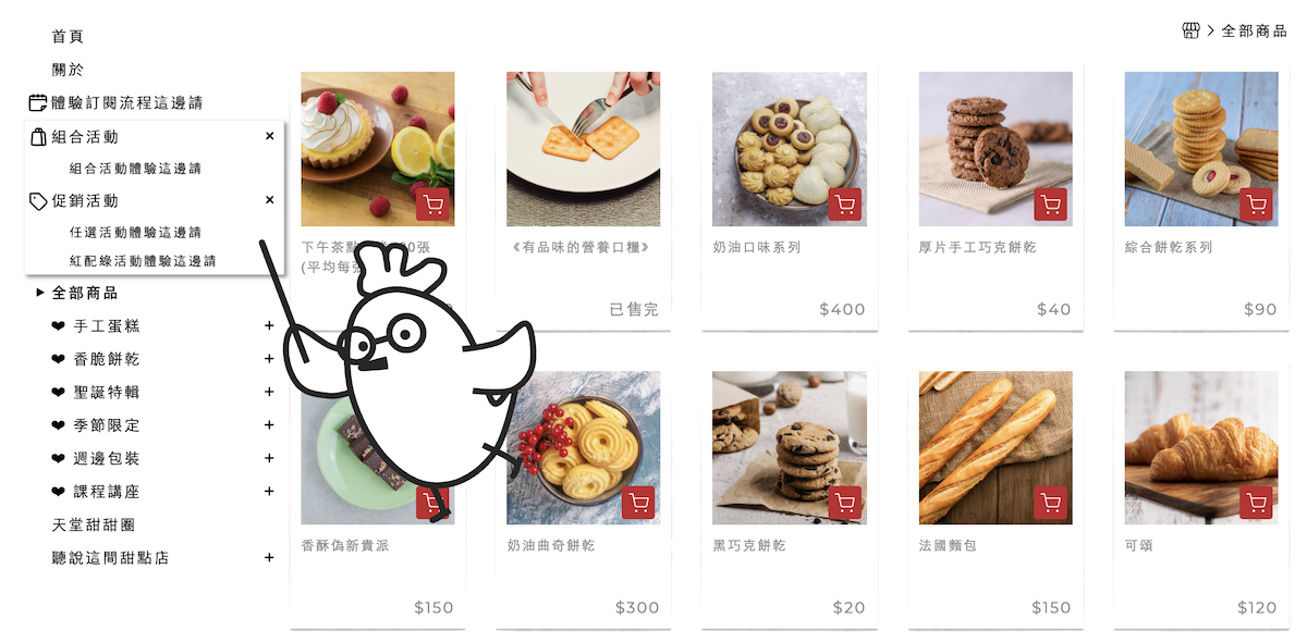 其他功能還有例如 自訂頁面 (這個頁面就是自訂頁面喔!) 和部落格區。你可以利用自訂頁面作為 購物說明、客戶見證、特殊服務申請、門市位置介紹等等。部落格則能讓你累積品牌的優質內容。